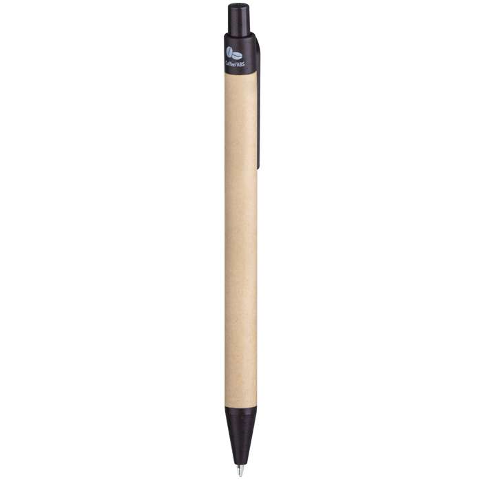 penna a sfera; meccanismo a scatto; corpo in carta; minuterie in 50% caffè e 50% ABS.; tecnica di stampa consigliata: serigrafica - tampografica - UV
