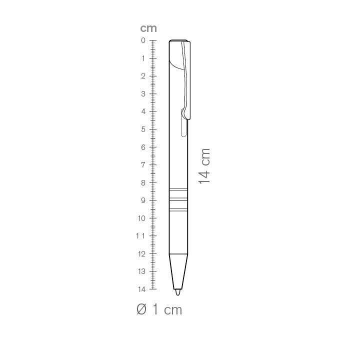 penna a sfera; meccanismo a scatto; corpo in alluminio; minuterie in metallo cromato; refill jumbo con sfera al tungsteno; inchiostro nero; Tecnica di stampa consigliata: Serigrafica, Incisione, Tampografica, UV