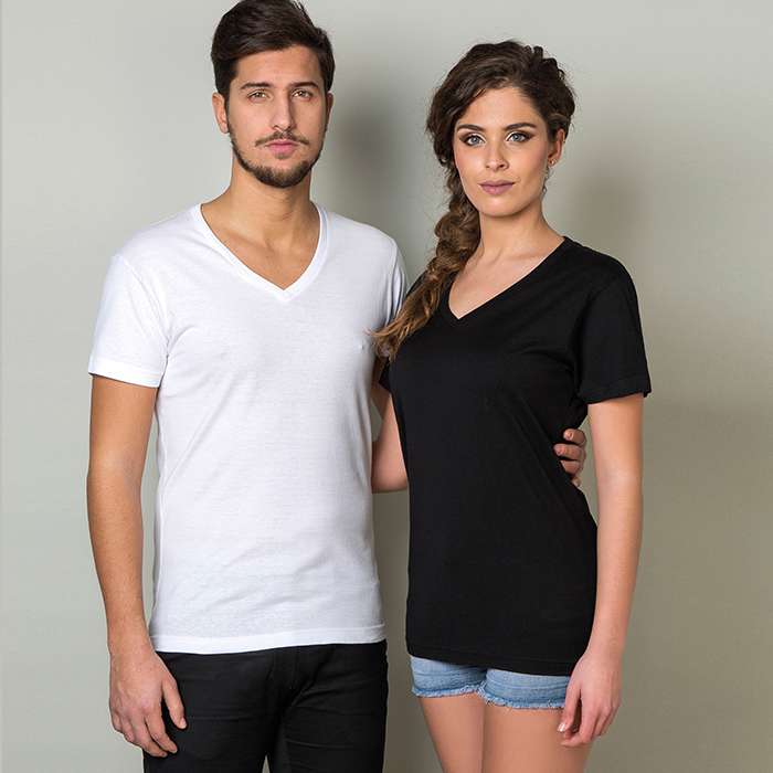 t-shirt adulto cotone pettinato; scollo a V costina rinforzata; ribattitura doppio ago su collo, maniche e orlo; nastro di rinforzo interno; colori reattivi; 150 gr
