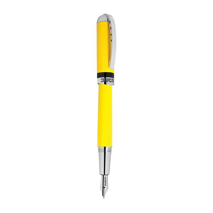 penna stilografica Ducati; fusto e cappuccio ottone; lacca multistrato ad alto spessore (oltre 40 micron); finitura lacca extra lucida; pennino in acciaio punta media; confezione in elegante astuccio regalo ricamato; minuterie in metallo cromato