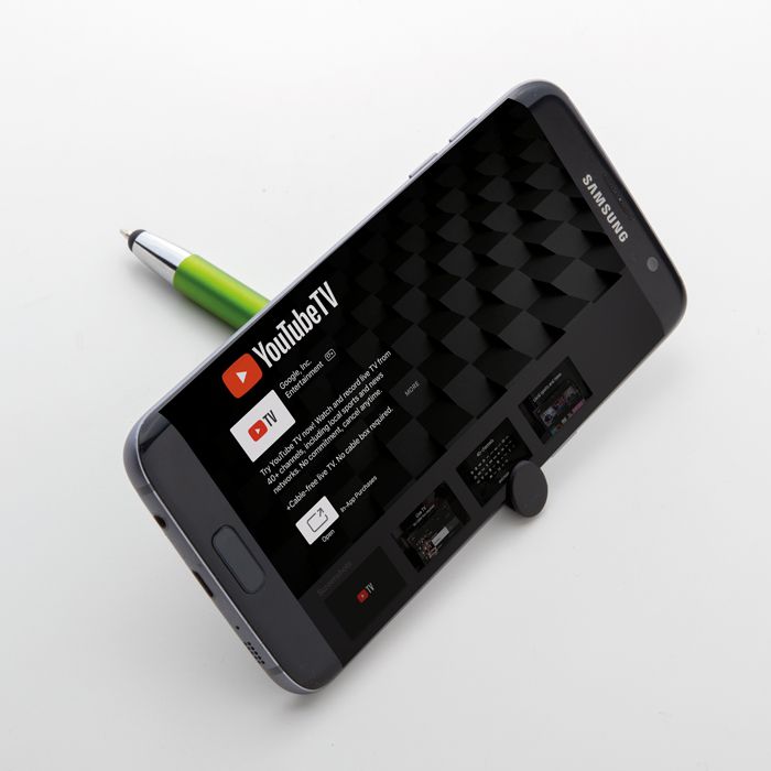penna a sfera con gommino per touch screen ex codice N0056; meccanismo a rotazione; grip in gomma; minuterie in metallo cromato; refill con sfera al tungsteno; inchiostro nero; tecnica di stampa consigliata: tampografica - UV