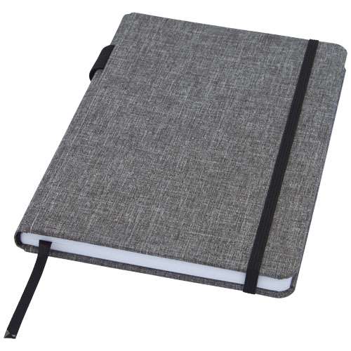 Quaderno formato A5 con coperchio in tessuto PET riciclato. Contiene 96 fogli di carta riciclata da 70 g/m² con layout foderato, asola portapenna e nastro segnalibro. Custodia di cartone.