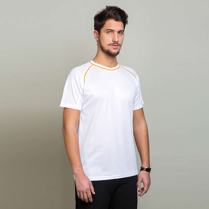 t-shirt adulto; tessuto mesh extra traspirante; trattamento cool plus; asciugatura rapida; girocollo a costina rinforzata; ribattitura doppio ago su collo, maniche e orlo; nastro di rinforzo interno; maniche raglan; colori reattivi; adatta alla stampa sublimatica; GI e VE colorazione fluo; 140 gr.
